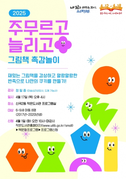 4월 17일 오후 4시에는 신곡2동 작은도서관에서 6~9세 아동을 대상으로 그림책 촉감놀이 ‘주무르고 늘리고’를 진행한다.