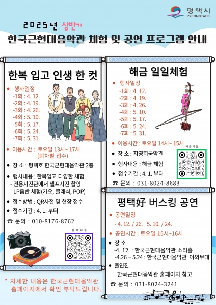 관련 내용은 한국근현대음악관 누리집, 인스타그램을 통해 확인할 수 있으며 참여 희망자는 정보무늬를 통해 4월 1일부터 사전 예약하거나, 현장 접수할 수 있다.