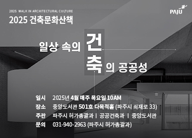 [금요저널] 파주시는 4월 한 달간 매주 목요일 오전 10시부터 12시까지 ‘2025 건축문화산책’ 강연을 개최한다.