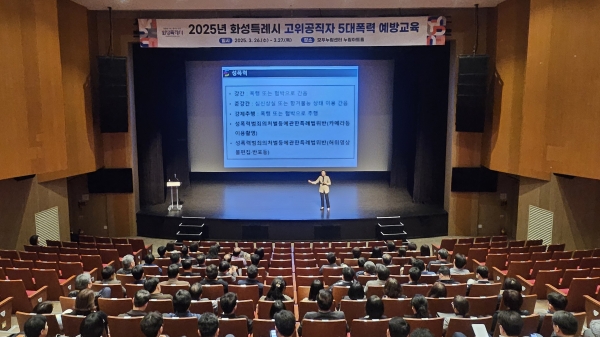 [금요저널] 화성특례시가 26일 모두누림센터 누림아트홀에서 5급이상 고위 공직자 150명을 대상으로‘5대폭력예방 통합교육’을 실시했다.