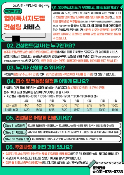 [금요저널] 안성시 아양도서관은 2025년 4월부터 11월까지 초등학생 4학년 이하의 자녀를 둔 가정을 대상으로 자녀 맞춤형 영어독서 지도법 컨설팅 서비스를 운영한다.