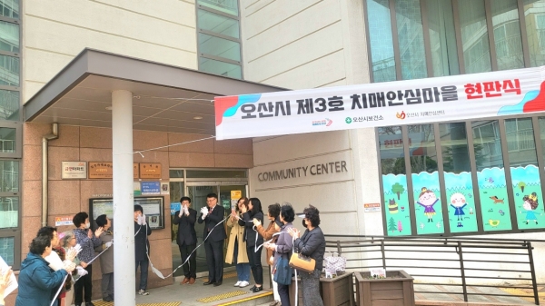 이번 현판식은 제3호 치매안심마을 지정을 알리고 치매 친화 환경 조성을 위해 진행됐으며 오산시보건소장, 대원1동장, 오산역 e-편한세상 1단지 경로당 회장 및 경로당 어르신들, 동대표 회장, 관리소장이 참석했다.