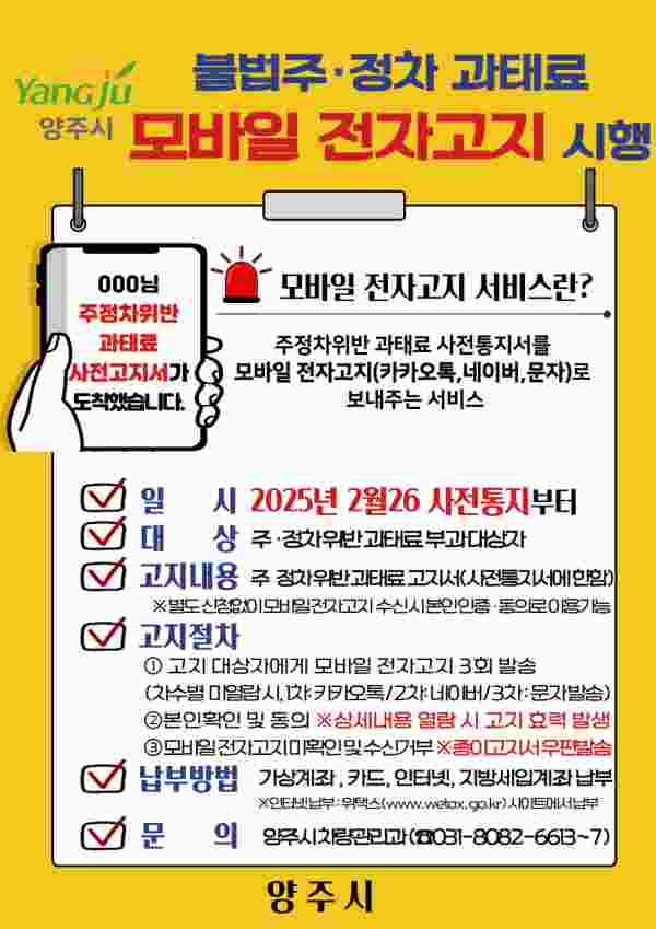 [금요저널] 양주시가 오는 4월부터 불법 주정차 위반 과태료 고지서를 모바일 전자문서로 발송하는 ‘모바일 전자고지 서비스’를 전면 시행한다.