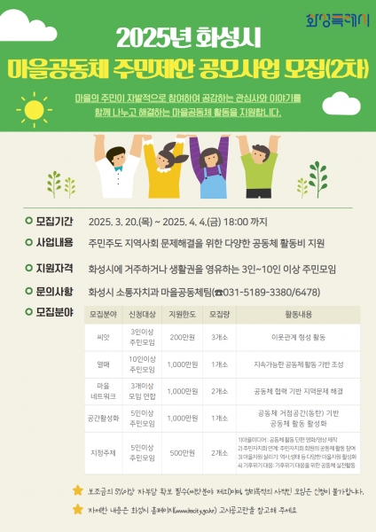 [금요저널] 화성특례시는 다음달 4일까지 주민 주도의 마을 문제 해결과 공동체 활성화를 위한 ‘2025년 마을공동체 주민제안 공모사업’ 2차 참여자를 추가 모집한다.