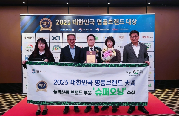 [금요저널] 평택시는 지난 27일 농특산물 통합브랜드 ‘슈퍼오닝’ 이 더 플라자 호텔에서 열린 ‘2025 대한민국 명품브랜드 大賞’에서 농특산물 브랜드 부문 대상을 받았다고 밝혔다.