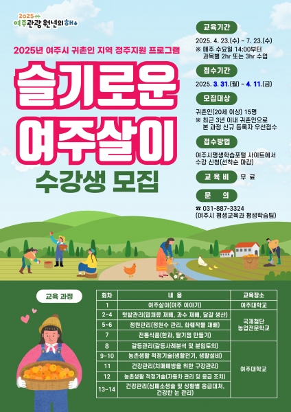 수강 대상은 여주로 귀촌한 지 3년 이내인 시민이며 신청은 이번 달 31일부터 다음 달 11일까지 여주시평생학습포털 사이트에서 가능하다.