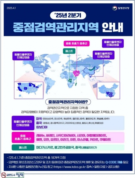 지난 3월 26일 질병관리청에서는 2024년도 해외감염병 발생 상황을 반영해 2025년도 2분기 중점검역관리지역과 검역관리지역을 재지정하고 4월 1일자로 시행한다고 발표했다.