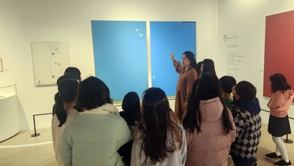 참여 어린이들은 학예연구사의 해설과 함께 ‘함께 그리다’ 전시를 관람하고 백영수 작가의 작품 속 주제, 색감, 표현 기법 등을 이해하는 시간을 가졌다.