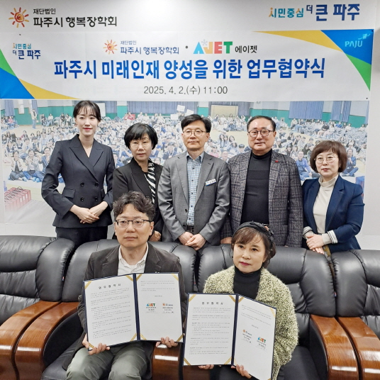 협약의 주요 내용은 △에이젯은 장학회 추천 학생에게 다양한 교육혜택 제공 △파주시행복장회는 에이젯에 장학사업 대상 학생 추천 △관내 초·중·고 학생 교육지원 확대 및 지역사회 교육 발전을 위해 두 기관 간 지속 협력 등이다.