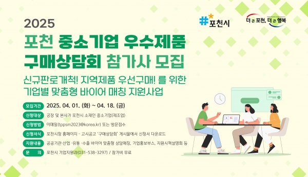 [금요저널] 포천시는 오는 18일까지 2025 포천 중소기업 우수제품 구매상담회에 참가할 관내 중소기업을 모집한다.