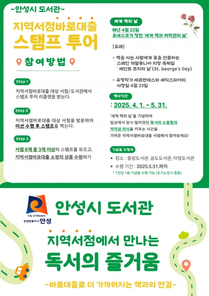 [금요저널] 안성시 도서관은 ‘지역서점 바로대출제’ 사업 홍보의 일환으로 ‘지역서점에서 만나는 독서의 즐거움 - 지역서점바로대출 스탬프 투어’를 운영한다고 밝혔다.