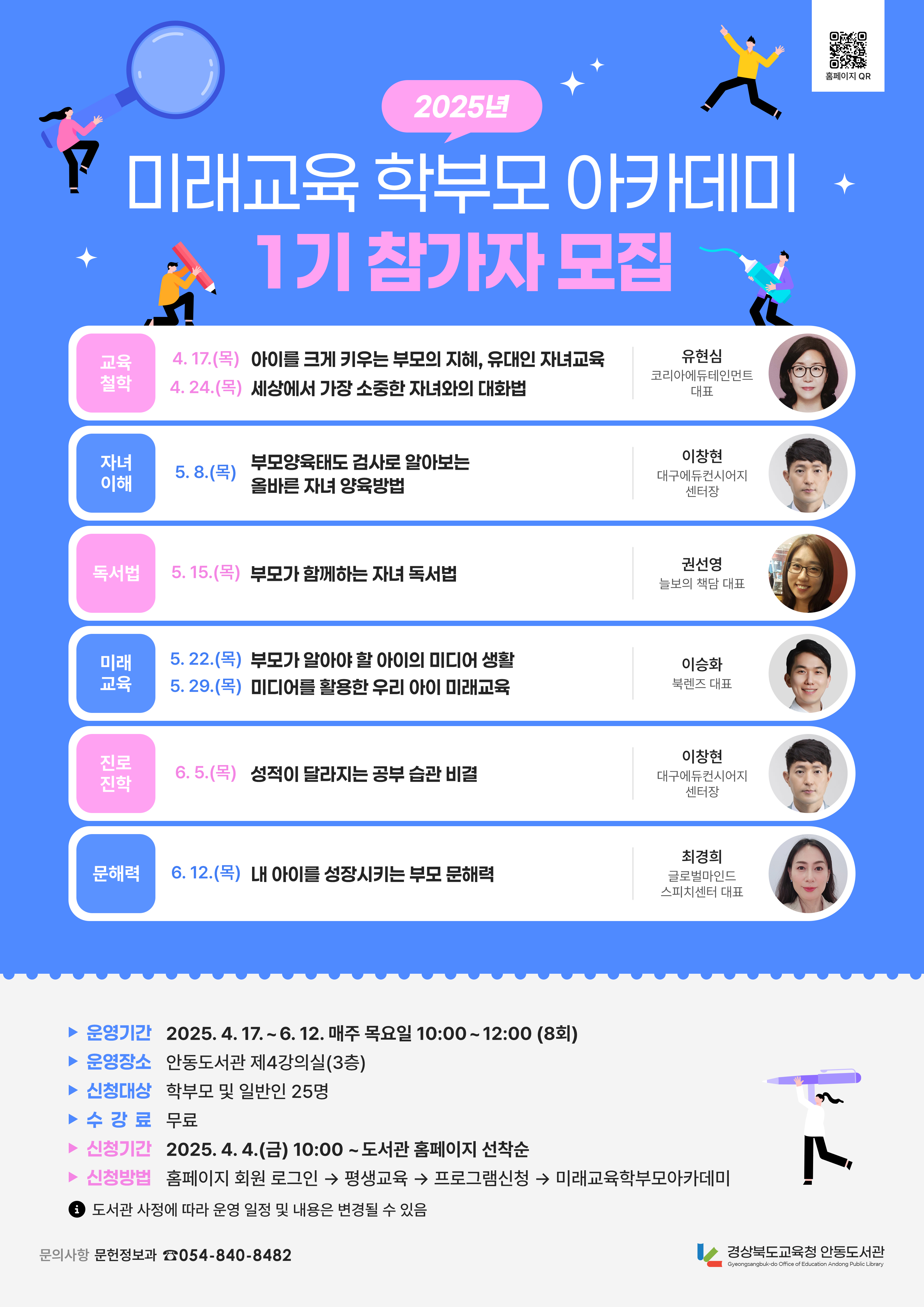 □ 경상북도교육청 안동도서관(관장 박용조)은 4월 17일부터 6월 12일까지 학부모 및 일반인을 대상으로「2025년 미래교육 학부모 아카데미 1기」를 운영한다.