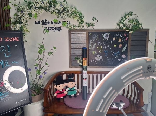 포토존에는 조명과 카메라 거치대, 그리고 의정부시 마스코트 ‘의돌이’ 와 ‘랑이’ 인형 소품이 비치돼 있어 누구나 자유롭게 촬영할 수 있다.
