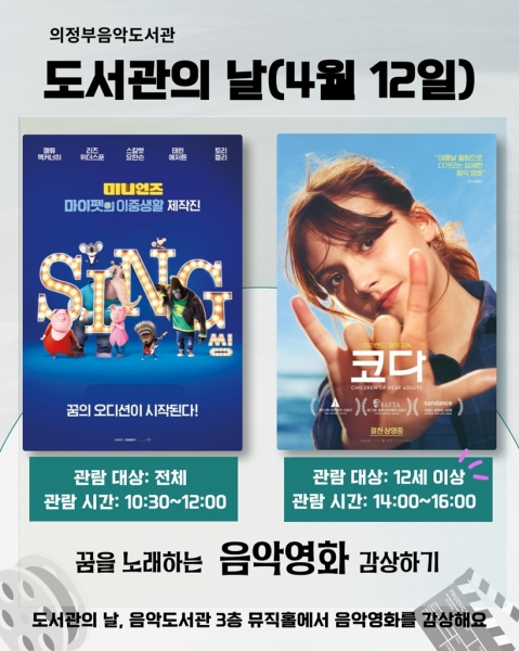 상영 시간은 12일 오전 10시 30분 ‘씽’, 오후 2시 ‘코다’로 총 2회이며 별도 예약 없이 당일 선착순으로 입장 가능하다.