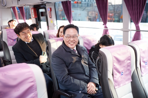 강수현 양주시장이 이른 아침부터 시민들과 함께 첫차에 직접 탑승해 교통 여건을 살피고 있는 모습이다.
