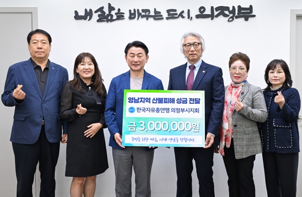 김동근 시장은 “이번 산불로 큰 피해를 입은 주민들께 깊은 위로의 마음을 전한다”며 “성금을 전달한 자유총연맹 의정부시지회에 감사드리며 나눔과 연대의 시민정신이 지역을 넘어 전국으로 퍼져 나가길 바란다”고 말했다.