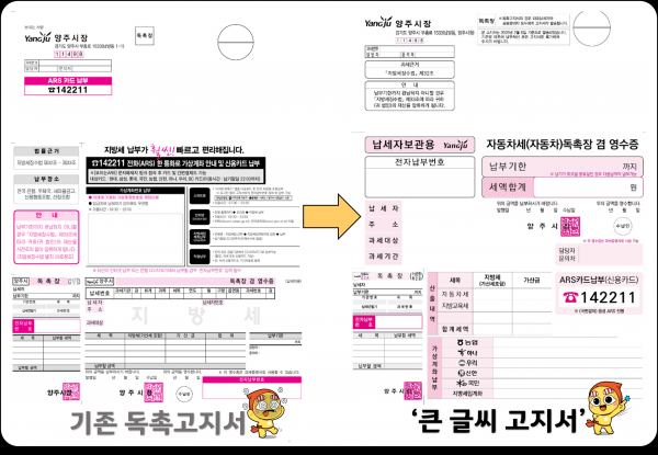 [금요저널] 양주시가 이번 4월 발송된 자동차세 독촉분부터 시민들이 더욱 쉽게 지방세 고지서를 확인하고 이해할 수 있도록 ‘큰 글씨 지방세 고지서’를 새롭게 도입했다고 밝혔다.