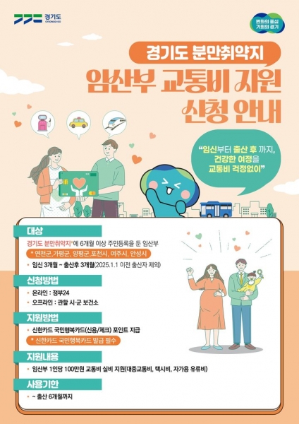 지원 금액은 임산부 1인당 최대 100만원이며 대중교통, 택시, 자가용 유류비 등으로 사용할 수 있는 카드 포인트 형태로 제공된다.