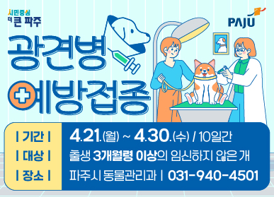 [금요저널] 파주시는 반려견을 동반한 야외 활동이 잦아지는 봄철을 맞아 오는 21일부터 30일까지 생후 3개월 이상의 임신하지 않은 개를 대상으로 광견병 예방접종을 실시한다고 밝혔다.