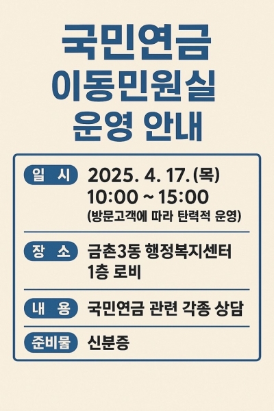 이동민원실은 오는 2025년 4월 17일 오전 10시부터 오후 3시까지 금촌3동 행정복지센터 1층에 마련되며 국민연금 가입·납부·연금 신청 절차 등 다양한 연금 관련 문의와 상담을 현장에서 바로 받을 수 있다.
