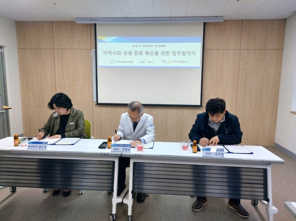 [금요저널] 파주시와 경기도의료원 파주병원, 파주지역자활센터가 14일 파주병원 회의실에서 ‘누구나, 지역에서 건강하게’ 지역사회 상생 문화 확산을 위한 업무협약을 체결하고 저소득 취약계층 일자리 창출 및 자립 기반 강화를 위해 협력해 나가기로 약속했다.
