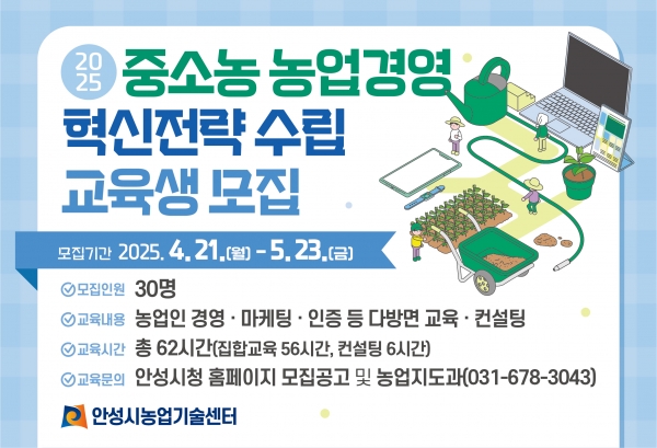 [금요저널] 안성시농업기술센터는 오는 4월 21일부터 5월 23일까지 ‘2025년 중소농 농업경영 혁신전략 교육’ 교육생을 모집한다고 밝혔다.