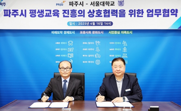 이번 협약은 김경일 파주시장, 유성상 서울대학교 평생교육원장, 최연경 운정2동장이 참석했으며 양 기관은 △주민 맞춤형 교육과정 기획 및 제공 △평생교육 발전을 위한 인적·물적 기반 공유 등에 대해서 협력하기로 했다.