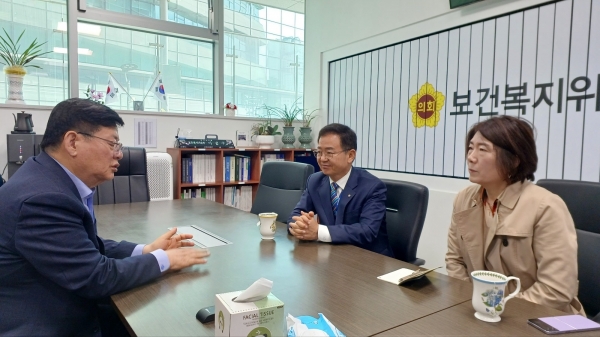 [금요저널] 경기도의회 보건복지위원회 이선구 위원장은 4월 17일 위원장실에서 이용빈 경기복지재단 대표이사와 임숙자 기획조정실장의 예방을 받고 보건복지 분야 정책역량 강화를 위한 정담회를 가졌다.