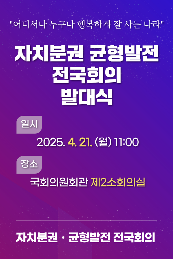 이번 전국회의는 '어디서나 누구나 행복하게 잘 사는 나라'를 슬로건으로 내걸고 자치분권과 균형발전이라는 시대적 과제에 대응하고자, 정치권과 학계 그리고 지역현장이 함께하는 협력적 거버넌스를 구축하기 위해 출범한다.