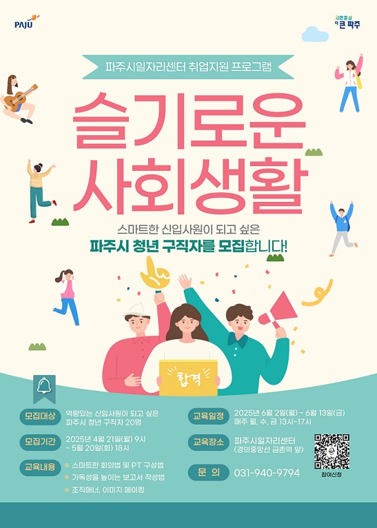 [금요저널] 파주시가 청년층을 위한 취업지원 프로그램 ‘슬기로운 사회생활’ 참여자 20명을 오는 4월 21일부터 5월 20일까지 모집한다.