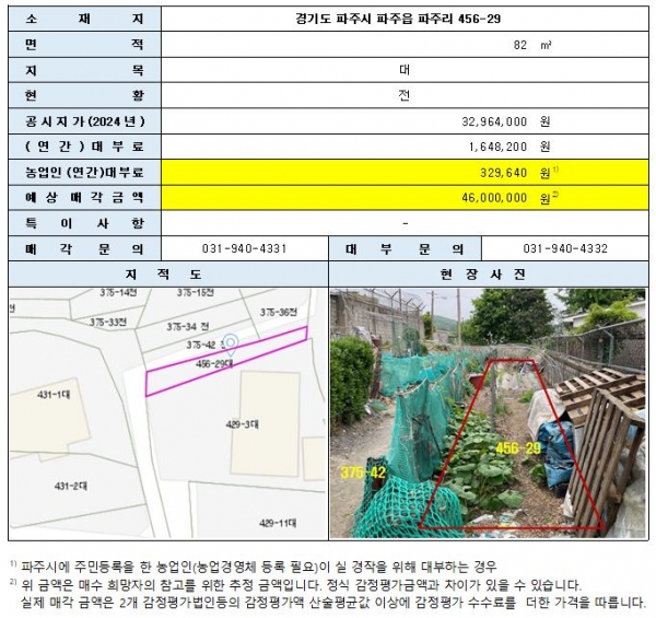 이에 더해 올해는 파주시 농업인이 경작을 위해 공유재산을 대부하는 경우의 감경 대부료와 시유지 매수신청 시 참고로 활용할 수 있는 예상 매각대금을 추가 공개한다.