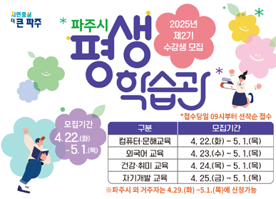 [금요저널] 파주시는 4월 22일부터 5월 1일까지 2025년 제2기 평생학습관 정규강좌에 참여할 수강생을 모집한다.