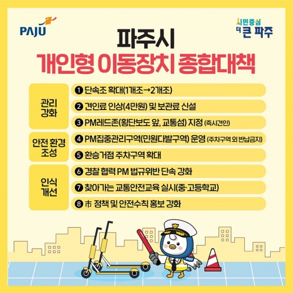 시는 2021년 3월, 경기 북부 최초로 ‘파주시 개인형 이동장치 이용 및 안전 증진 조례’를 제정해 개인형 이동장치 관리의 제도적 기반을 마련했다.