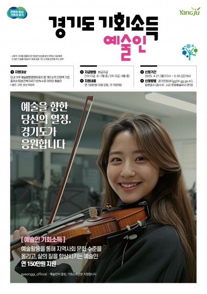 [금요저널] 양주시는 4월 21일부터 5월 30일까지 관내 예술인을 대상으로 ‘2025년 경기도 예술인 기회소득’ 신청을 받는다.