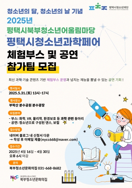 [금요저널] 평택시청소년재단 평택시북부청소년문화의집은 청소년의 달인 5월과 청소년의 날인 마지막 주 토요일을 기념해 5월 31일 진행되는 평택시북부청소년어울림마당 ‘평택시 청소년과학페어’ 부스 운영진과 공연 참가팀을 모집한다고 밝혔다.