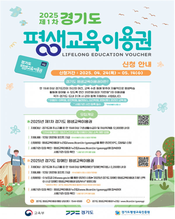 1차는 4월 24일부터 저소득층을 위한 일반 평생교육이용권과 장애인 평생교육이용권이 대상이며 신청기간은 4월 24일부터 5월 14일까지이다.