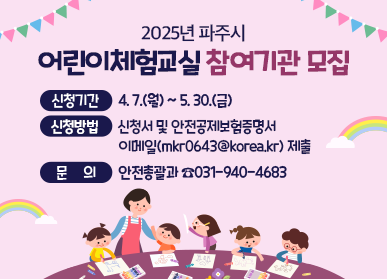 [금요저널] 파주시가 오는 5월 말까지 ‘2025년 어린이 안전체험교실’에 참여할 기관을 모집한다.