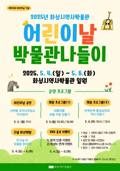 [금요저널] 화성특례시가 화성시 역사박물관에서 제103회 어린이날을 맞아 다음 달 4일부터 6일까지 문화프로그램 ‘어린이날 박물관 나들이’를 운영한다.