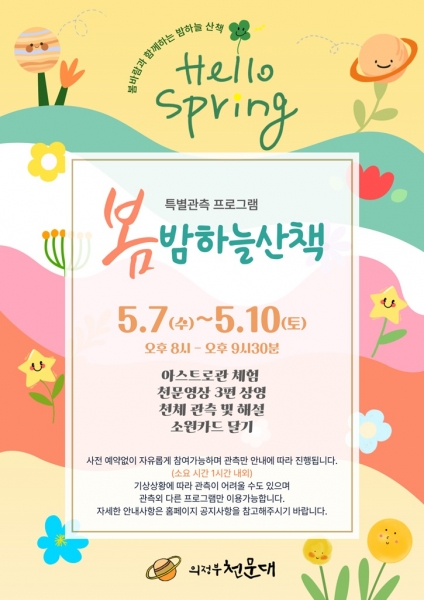[금요저널] 의정부과학도서관은 과학에 대한 관심을 높이고 천문대의 대중화를 도모하고자, 5월 7일부터 10일까지 의정부천문대에서 특별관측행사 ‘봄 밤하늘 산책’을 운영한다.