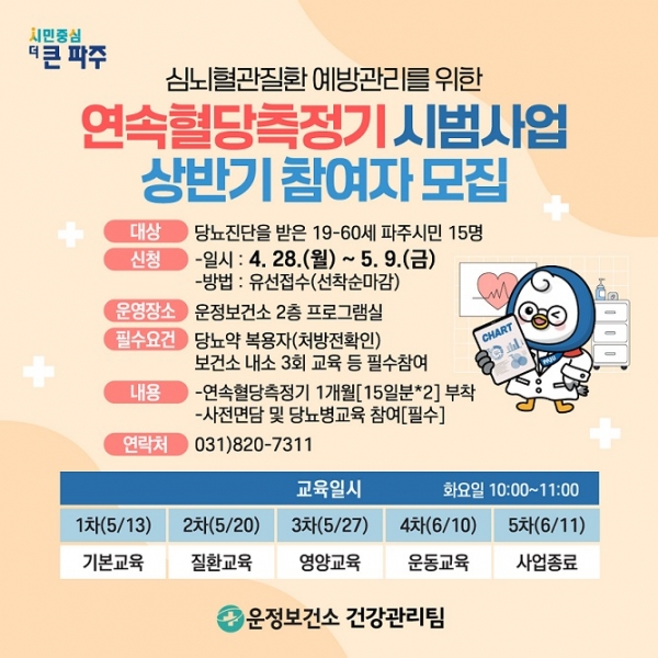[금요저널] 파주 운정보건소는 심뇌혈관질환 예방관리사업의 일환으로 ‘연속혈당측정기 시범사업’ 추진 계획을 밝히면서 이달 28일부터 5월 9일까지 2주간 참가 대상자 모집을 공지했다.
