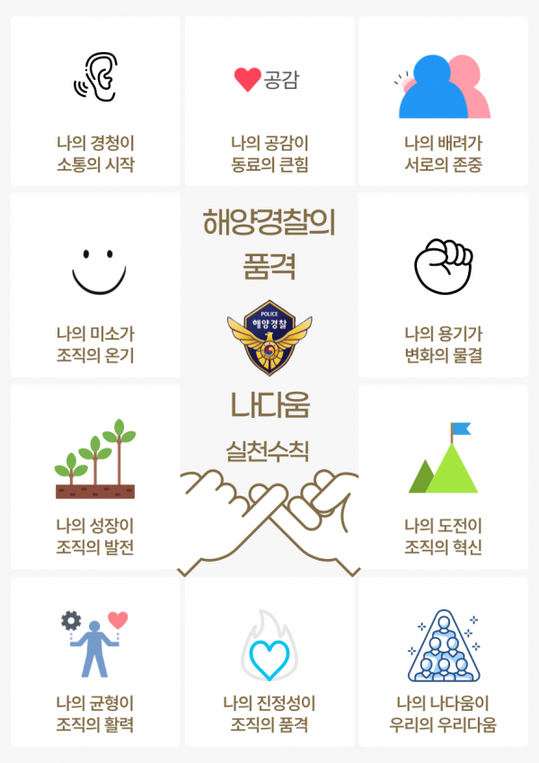 김용진 해양경찰청장은 “변화관리의 힘은 첨단 장비와 시스템을 바탕으로 그것을 운용하는 사람에게서 나온다”며 “해양경찰의 모든 구성원이 존중받고 자신의 역량을 최대한 발휘할 수 있는 환경을 조성하는 것이 이 프로젝트의 핵심”이라고 강조했다.