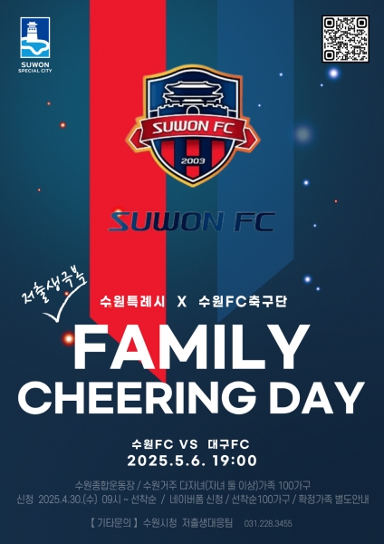 수원시민 가족응원데이는 지역 연고 스포츠 구단 지원으로 수원시에 거주하는 다자녀 가구를 스포츠 경기에 초청하는 저출생 대응 사업이다.