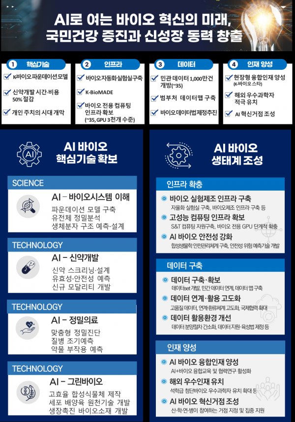이를 기반으로 AI 바이오 융합을 통한 혁신을 더욱 가속화하기 위해 관계부처 합동으로 ‘AI 바이오 확산 전략’을 수립했다.