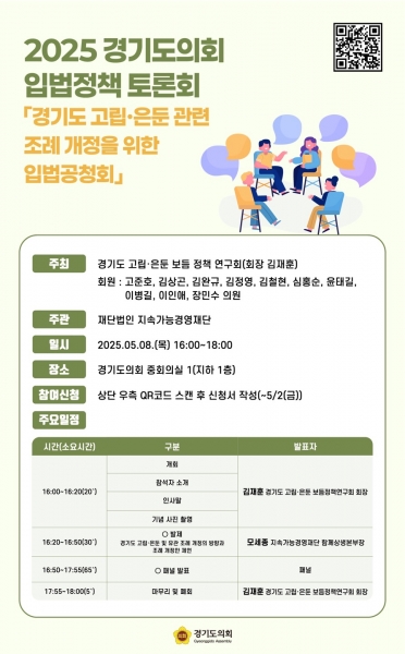 [금요저널] 경기도의회 고립·은둔 보듬 정책 연구회가 오는 5월 8일 오후 4시, 경기도의회 중회의실1에서 ‘경기도 고립·은둔 관련 조례 개정을 위한 입법공청회’를 개최한다.
