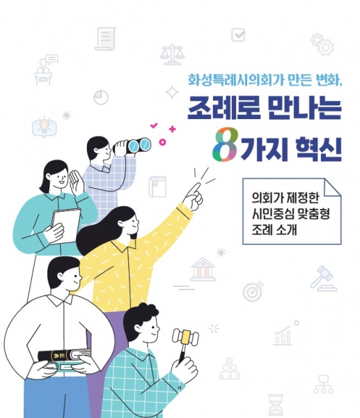 “화성특례시의회가 만든 변화, 조례로 만나는 8가지 혁신” 분야별 조례 1. 시민과 함께하는 스마트 공공서비스 · 화성시 범죄피해자 보호 및 지원에 관한 조례 · 화성시 마을방송시스템 운영 및 지원에 관한 조례 · 화성시 인공지능 기본 조례 2. 투명한 행정과 신뢰받는 시스템 · 화성시의회 갑질 행위 근절 및 피해자 지원 조례 · 화성시 예비군 훈련장 차량운행 지원 조례 · 화성시 업무추진비 집행기준 및 공개에 관한 조례 3. 전통과 첨단이 함께하는 산업 허브 · 화성시 반도체산업 육성 및 지원 조례 · 화성시 중소기업대상 운영 조례 · 화성시 수향미가공산업 유치 및 육성에 관한 조례 4. 미래 세대를 지키는 지속가능 라이프 · 화성시 삼보폐광산 민·관·정 협의체 설치·운영 조례 · 화성시 기후위기 대응을 위한 탄소중립·녹색성장 기본 조례 · 화성시 물 절약을 위한 절수설비 및 절수기기 설치에 관한 조례 5. 아이부터 어른까지, 모두가 살기 좋은 도시 · 화성시 남성 육아휴직 장려 활성화 지원 조례 · 화성시 아동보호구역 운영에 관한 조례 · 화성시 노인 보청기 및 성인용 보행기 지원 조례 · 화성시 재가노인지원서비스 지원에 관한 조례 6. 건강한 몸과 마음, 활기찬 지역사회 · 화성시 은둔·고립형 가구 지원 조례 · 화성시 정신건강 증진 및 위기대응체계 구축에 관한 조례 · 화성시 감염병의 예방 및 관리에 관한 조례 7. 쾌적한 주거, 편리한 교통 인프라 · 화성시 택시산업 발전 지원 조례 · 화성시 화물자동차의 밤샘주차에 관한 조례 · 화성시 신혼부부 전세자금 대출이자 지원 조례 8. 체계적인 재난관리, 안전한 화성 · 화성시 침수 방지시설 설치 및 지원에 관한 조례 · 화성시 고령운전자 안전운전 및 교통사고 예방에 관한 조례 · 화성시 생활위험수목 처리 지원에 관한 조례제9대 화성특례시의회 의원들은 “지속적인 조례 제·개정을 통해 시민과 함께 지속 가능한 도시를 만들어가는 입법 동반자로서 역량을 모아, 열정과 진정성을 갖춘 책임감으로 의정활동에 매진할 것”이라고 목소리를 모았으며 배정수 의장은 “시민 한 사람 한 사람의 일상을 바꾸는 입법 활동이야말로 지방의회의 본질적 역할”이라며 “의회가 만들어 가는 변화들이 시민의 일상에 온기를 더하고 함께하는 더 나은 내일로 이어질 수 있도록 노력하겠다”고 밝혔다.