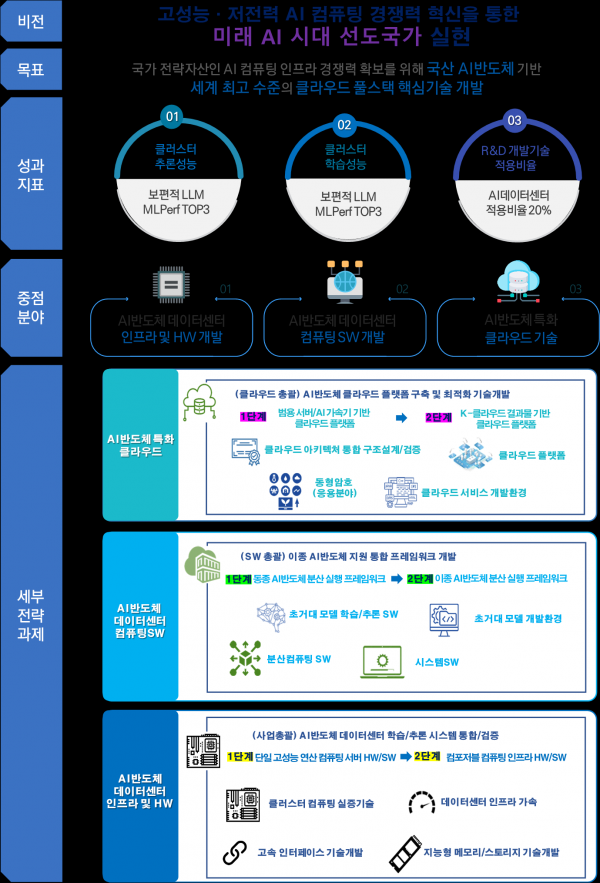 동 사업은 국산 인공지능 반도체에 특화된 데이터센터 기반 시설 및 하드웨어, 컴퓨팅 소프트웨어, 인터넷 기반 자원공유 등 3개 전략분야 28개 세부과제로 구성되어 있다.