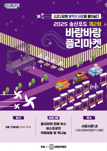 [금요저널] 화성특례시가 17일 송산면 사강시장에서 ‘2025 송산포도 제2회 바람바람 플리마켓’을 개최한다고 밝혔다.