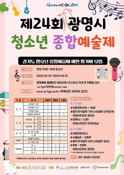 광명시가 후원하고 한국예총 광명지회가 주관하는 이번 예술제는 제24회 대회로 오는 6월 13일부터 14일까지 광명시민회관에서 열린다.