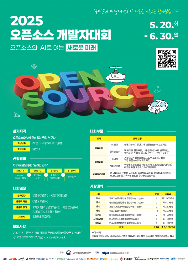 [금요저널] 과학기술정보통신부는 인공지능·소프트웨어 시대의 핵심 기반이자 국제 기술 경쟁력의 근간인 공개 자료 생태계 활성화를 위해‘2025년 공개 자료 개발자 대회’를 개최한다.