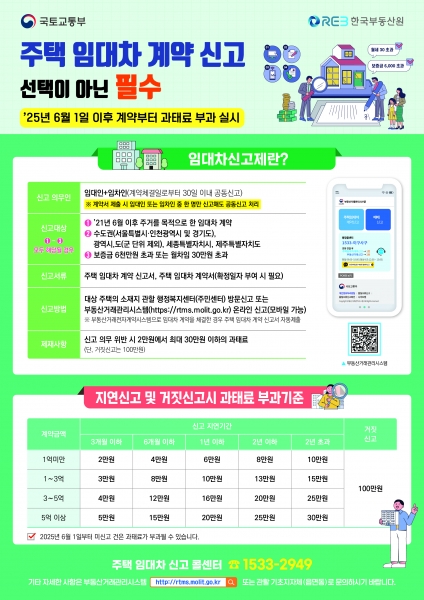 정기호 부동산관리과장은 “주택 임대차계약 신고제는 주택 임대차 시장의 투명성 확보와 임대·임차인 간 정보 비대칭을 해소하기 위한 제도”며 “6월부터는 계도기간이 종료되므로 반드시 기한 내 신고해 불이익을 받지 않도록 유의해주시길 바란다”고 말했다.